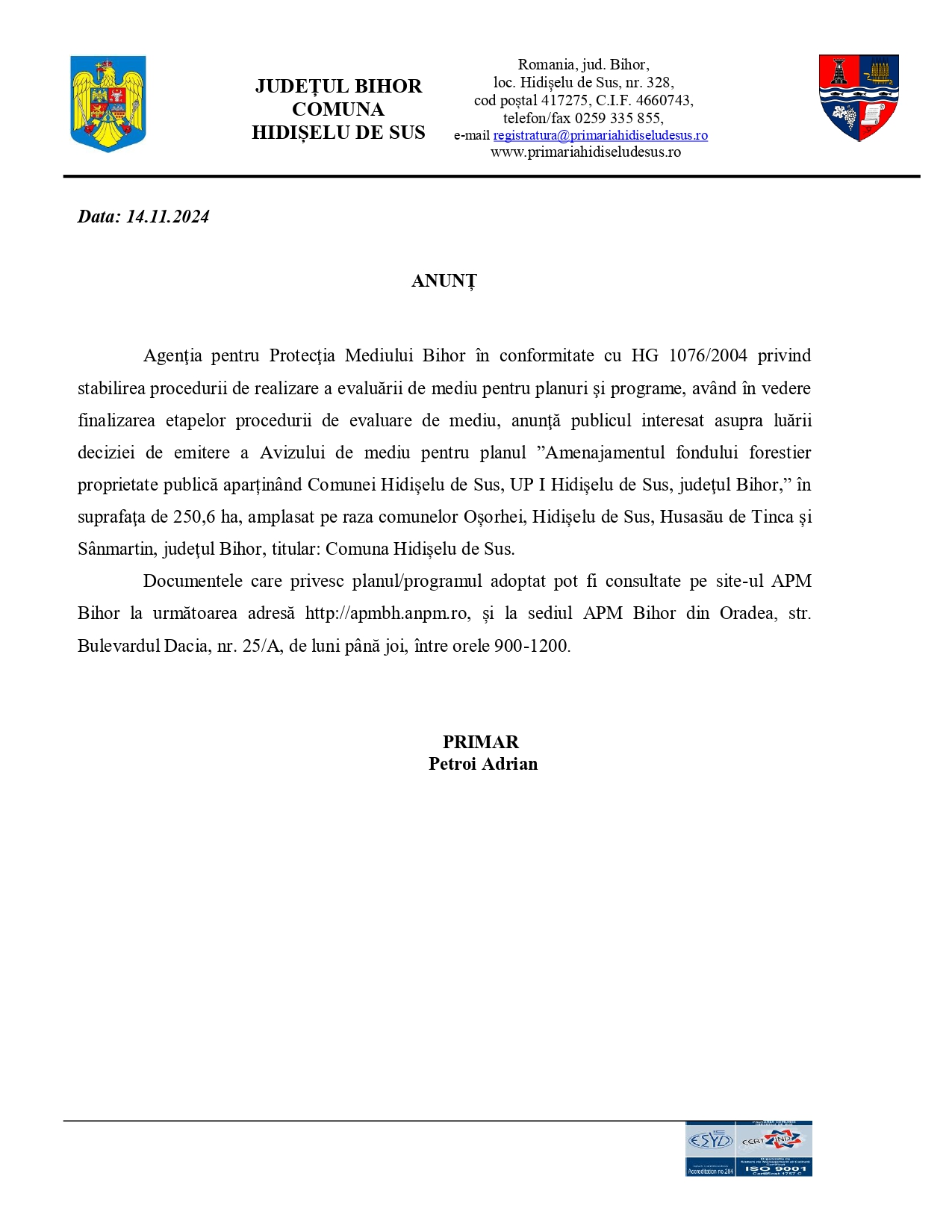 Agenţia pentru Protecţia Mediului Bihor în conformitate cu HG 1076/2004 privind stabilirea procedurii de realizare a evaluării de mediu pentru planuri şi programe, având în vedere finalizarea etapelor procedurii de evaluare de mediu, anunţă publicul interesat asupra luării deciziei de emitere a Avizului de mediu pentru planul ”Amenajamentul fondului forestier proprietate publică aparținând Comunei Hidișelu de Sus, UP I Hidișelu de Sus, judeţul Bihor,” în suprafaţa de 250,6 ha, amplasat pe raza comunelor Oșorhei, Hidișelu de Sus, Husasău de Tinca și Sânmartin, judeţul Bihor, titular: Comuna Hidișelu de Sus.